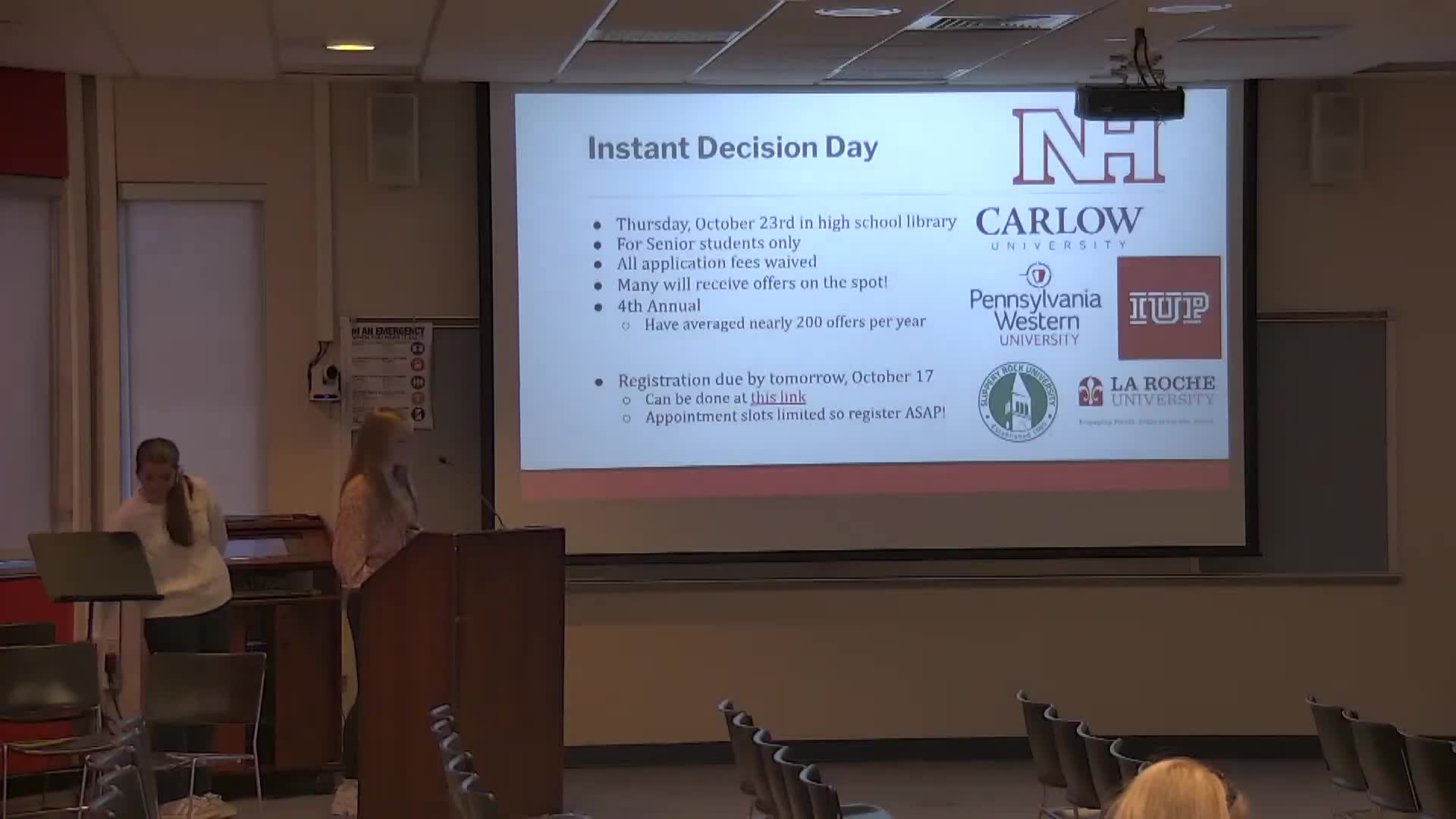 Jane said Instant Decision Day will be held Thursday, Oct. 23 in the high school library, and that registration for the event is due Oct. 17. She said the event has averaged nearly 200 offers per year in prior editions and that colleges commonly waive application fees and sometimes grant admission on the spot, streamlining the application process for students.