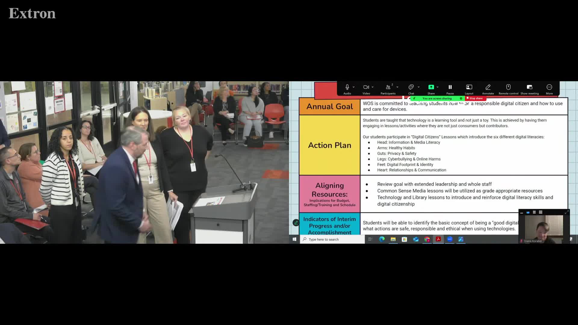 The presentations emphasized two strands of the district's work: teaching responsible, ethical use of technology and building the social‑emotional and leadership skills in a districtwide "profile of a graduate." Presenters described practical classroom routines, family engagement efforts and assessment timelines tied to those priorities.