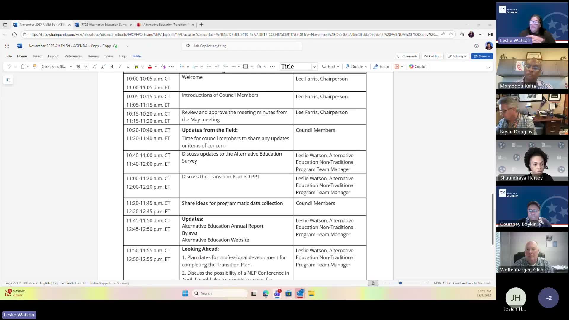 Process and next steps: Watson said she will meet with the team that builds the survey and bring concrete draft changes to the council at the next meeting. The council approved the prior meeting minutes by consensus (no roll call or tally was recorded). The proposed survey edits will be finalized and presented for implementation after the TDOE survey team incorporates the changes.