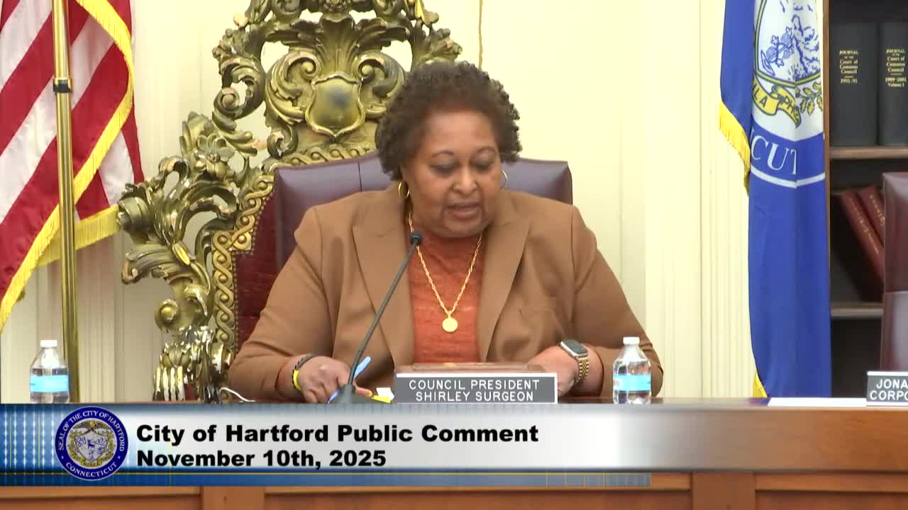 Bill Katz, a Hartford resident, told the City Council during public comment that multiple utility poles near his Southwest Hartford neighborhood remain partially broken or have dangling pieces that he characterized as a safety hazard to children. Katz said he sent letters and photos to council members showing three specific locations: the corner of Lynnmore Street and Maple Avenue; Hillside Avenue near White Street; and Summit Street across from Trinity College.