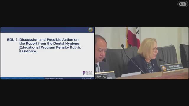 The Education Committee received an update from the Dental Hygiene Educational Program Penalty Rubric Task Force, which has met seven times to categorize program violations and recommend remediation timeframes. The committee also reviewed site‑visit findings showing several programs on temporary probation or noncompliance, and heard a lengthy