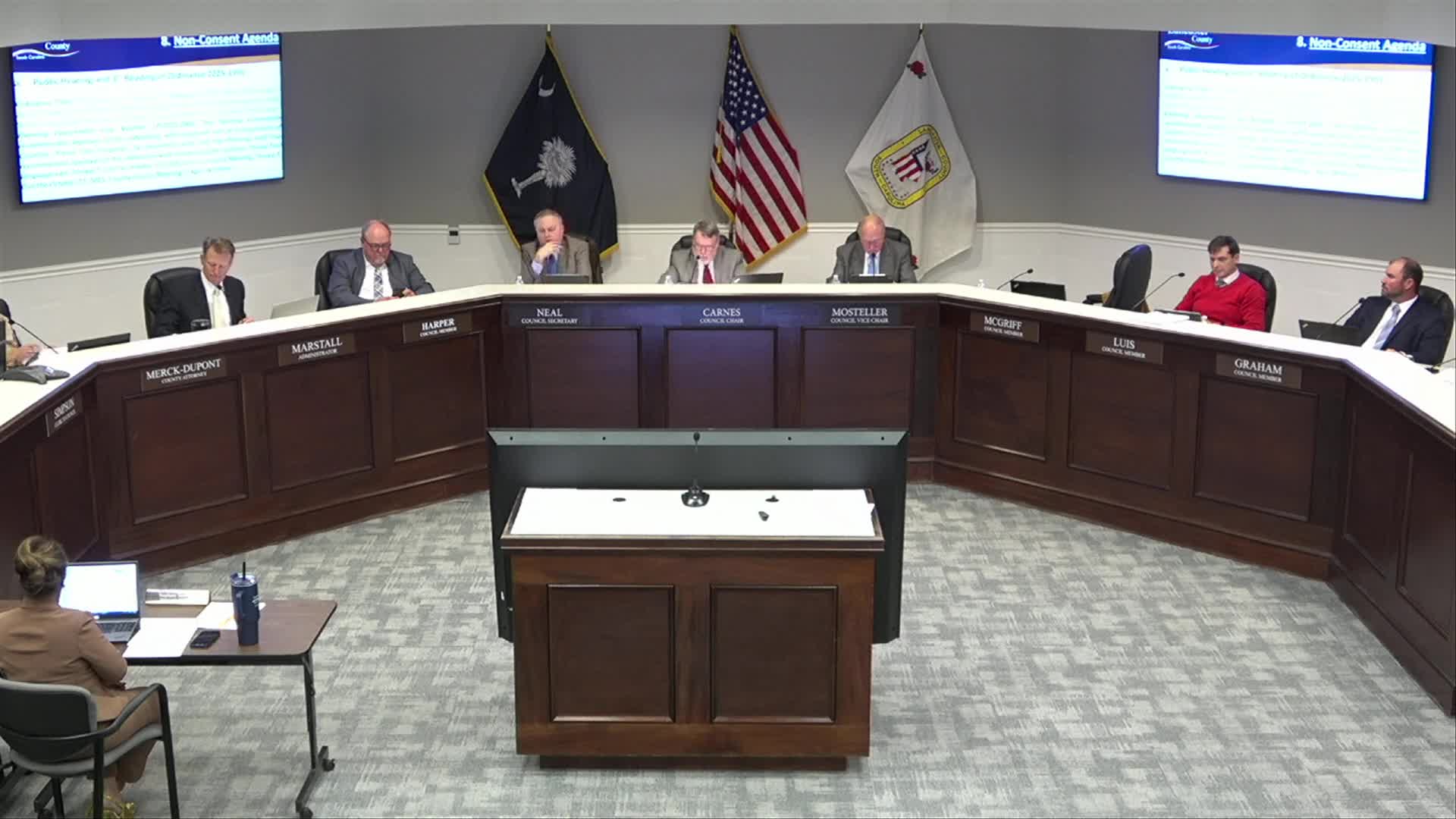 The Lancaster County Council voted Nov. 10 to approve on first reading an ordinance (2025‑2007) authorizing a county lease of vacant space at the Barnett Building (1228 Colonial Commons Court, Suite 101) to Finding Serenity, a nonprofit partner of the Women’s Enrichment Center that will receive and distribute donated goods from an Amazon partner program.