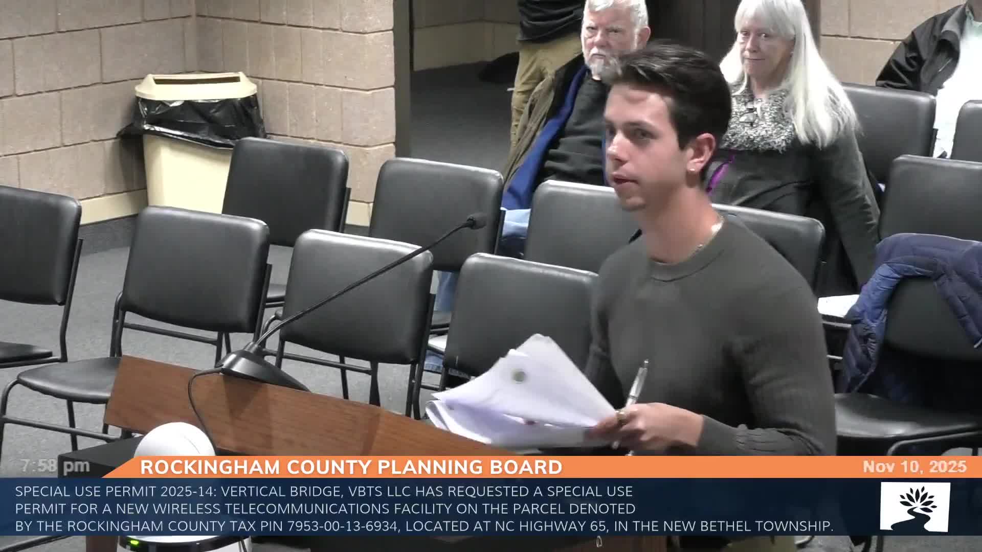 Planning staff introduced case 2025‑14 for a proposed 254‑foot tower on NC‑65 (PIN 795300136934). Applicant Clark Davidson presented RF propagation maps, a NEAR report and third‑party structural review. Neighbors asked why co‑location on existing towers was not used and raised concerns about beacon lights and property values. Davidson said propagation maps showed coverage gaps and that FAA lighting is required; he added the tower is engineered to ‘‘crumple upon itself’’ within the calculated fall zone. "The preference is not to build a new tower," Davidson said, "but the maps show substantial improvement in coverage in this area."
