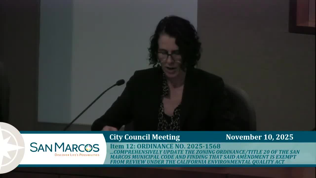 San Marcos — The City Council introduced a first-phase text amendment to Title 20 of the San Marcos Municipal Code on Tuesday, asking staff to move forward with a broadly scoped zoning update intended to align local regulations with state law and correct years of inconsistent language.