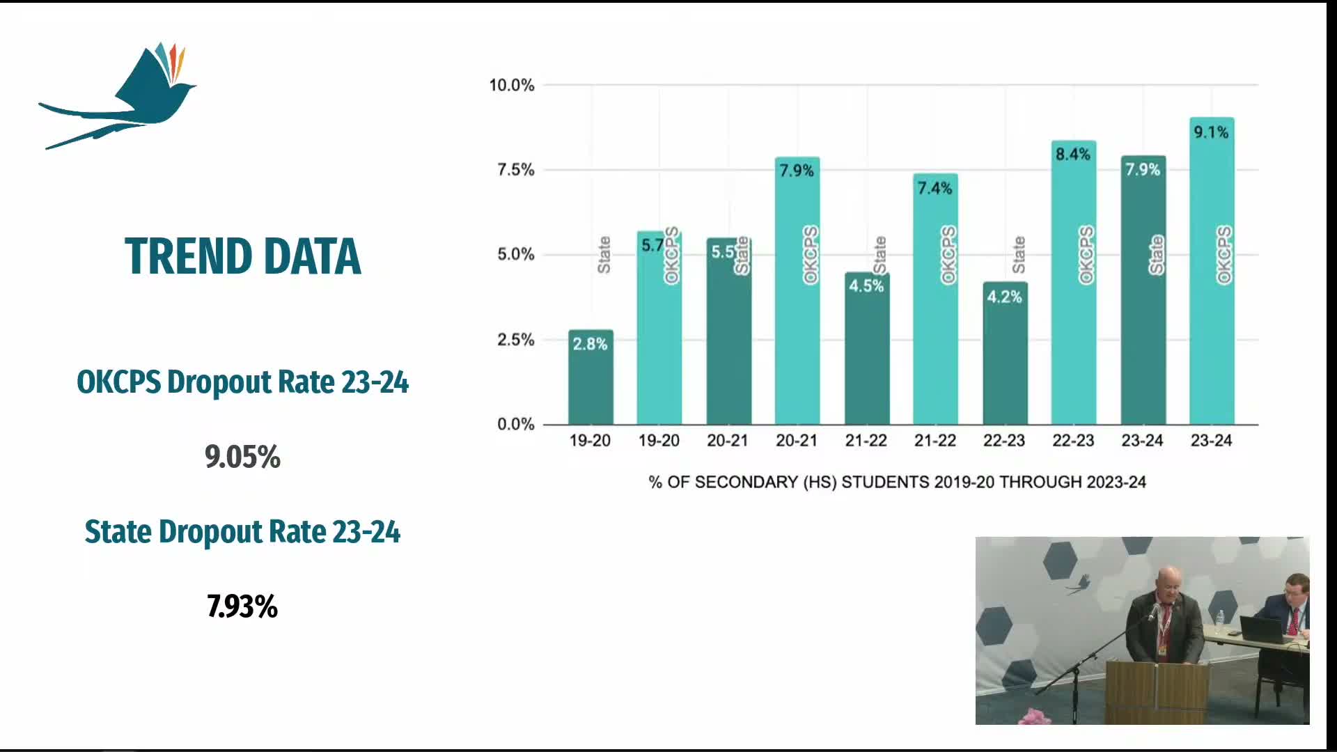 District officials reported OKCPS' 2023–24 dropout rate at 9.1% versus the state 7.9% and the national 5.3%. College remediation for district students who enroll in state colleges is 19.2%. Presenters tied absenteeism, mobility and economic disadvantage to higher dropout risk.
