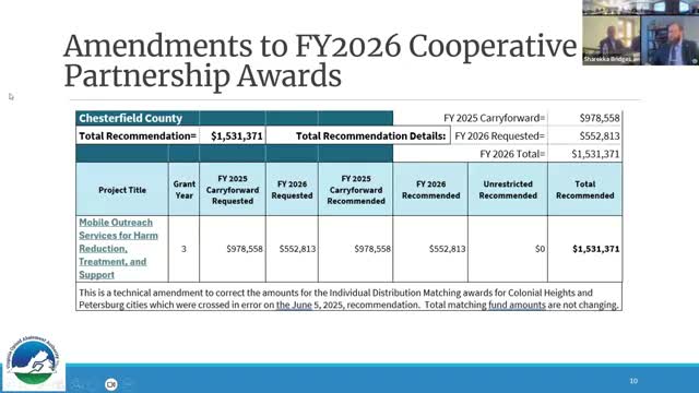 The committee also approved a block of technical amendments to city and county awards and a separate block of state agency amendments. Staff described several corrections and administrative actions, including a reallocation to Chesterfield County’s mobile outreach services award, a correction to Harrisonburg’s peer‑recovery center award (OAA funds corrected to $200,000 with a reported $50,000 non‑OAA match), a planning grant performance‑period extension for Suffolk City scheduled to align its application with the March 2026 cycle, and scope adjustments for a Department of Behavioral Health and Developmental Services judicial training project.