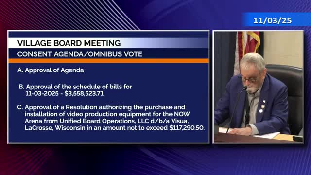 The Village of Hoffman Estates board on Nov. 3 approved a consent agenda that included a resolution authorizing the village president to enter into an intergovernmental agreement (IGA) with School District U‑46 allowing the Hoffman Estates Police Department to view school surveillance cameras to investigate potential criminal activity. Trustees also approved a purchase not to exceed $117,290.50 for video‑production equipment for the NOW Arena and a design engineering contract with Living Waters Consultants Inc. for 925 Grand Canyon Parkway not to exceed $57,000.
