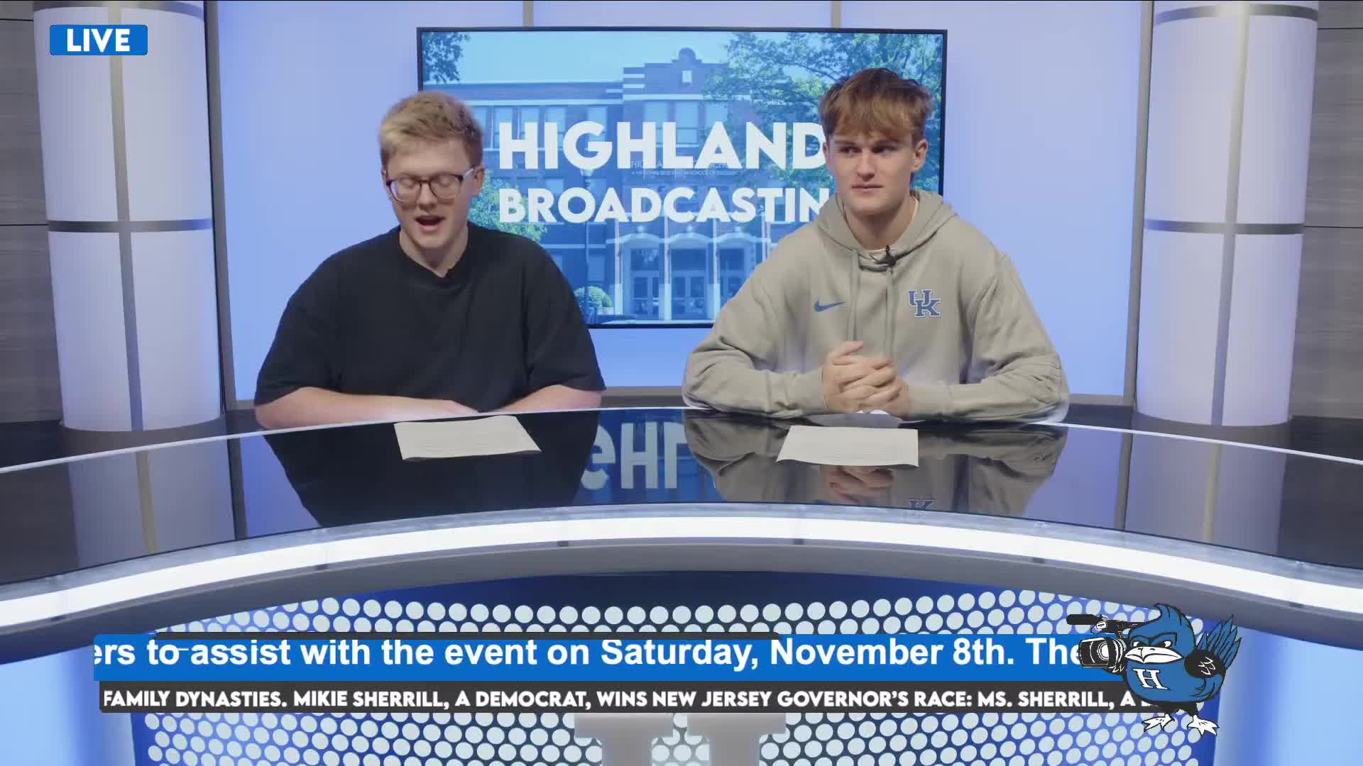 The provided transcript is a Highlands High School student announcements broadcast (morning announcements) listing school events, a fundraiser, testing dates, and lunch menus. This content is non-civic and not suitable for civic meeting article generation, so no civic articles were produced.