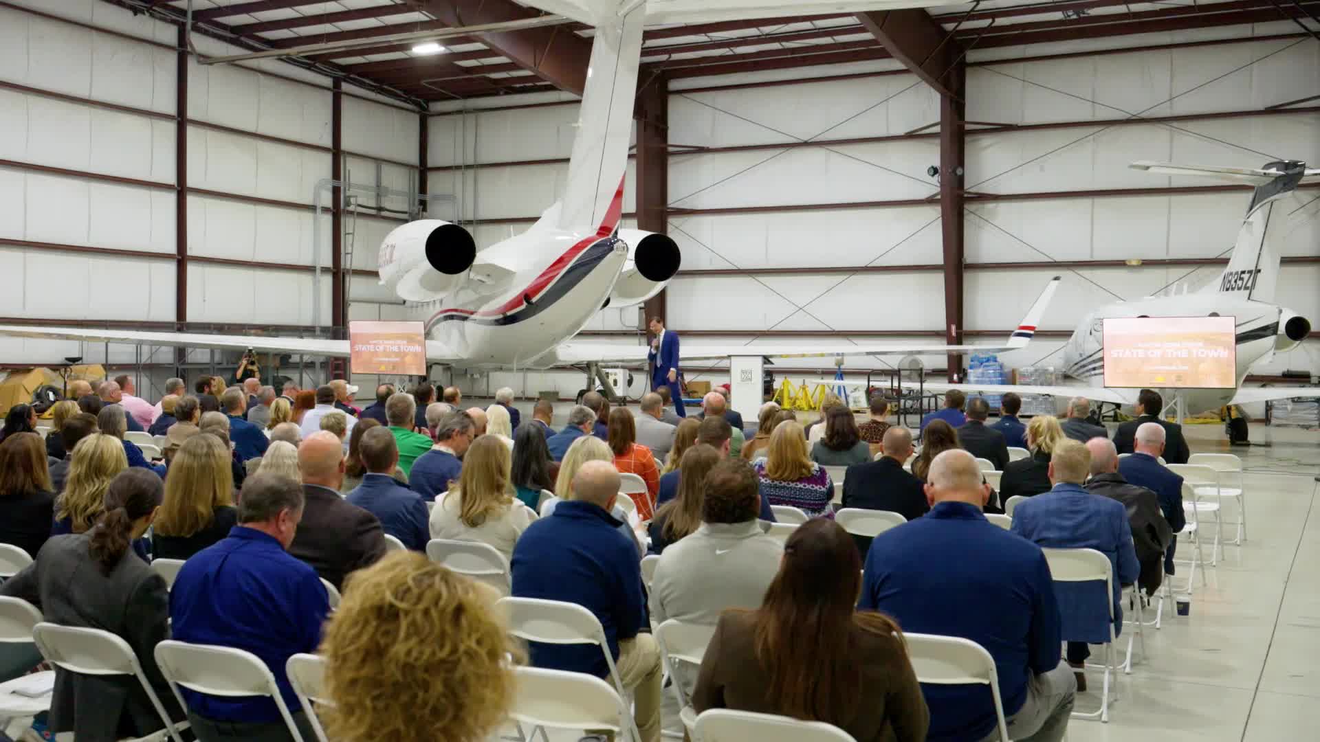 Mayor John Stair told a packed audience at the Indianapolis Executive Airport that Zionsville is positioned to invest in public safety, parks and economic development even as state policy threatens local revenue. "It is, devastating for us," Stair said of Senate Bill 1, adding the town will receive "far less revenue than we had expected" for several years and that council members may have to consider a local income tax in 2028 if the gap remains.