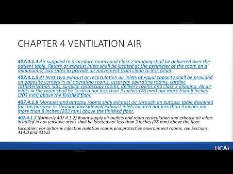 Enright also described a new requirement for exhaust-discharge heights and separation distances from outdoor air intakes for infection-control spaces (bronchoscopy, compounding, morgues), and said the minimum AIIR (airborne infection isolation room) height was updated from 7 feet to 10 feet to match ASHRAE 170 (2021). He emphasized that testing and balancing will include pressure testing at doors to verify directional pressure and alarm requirements.