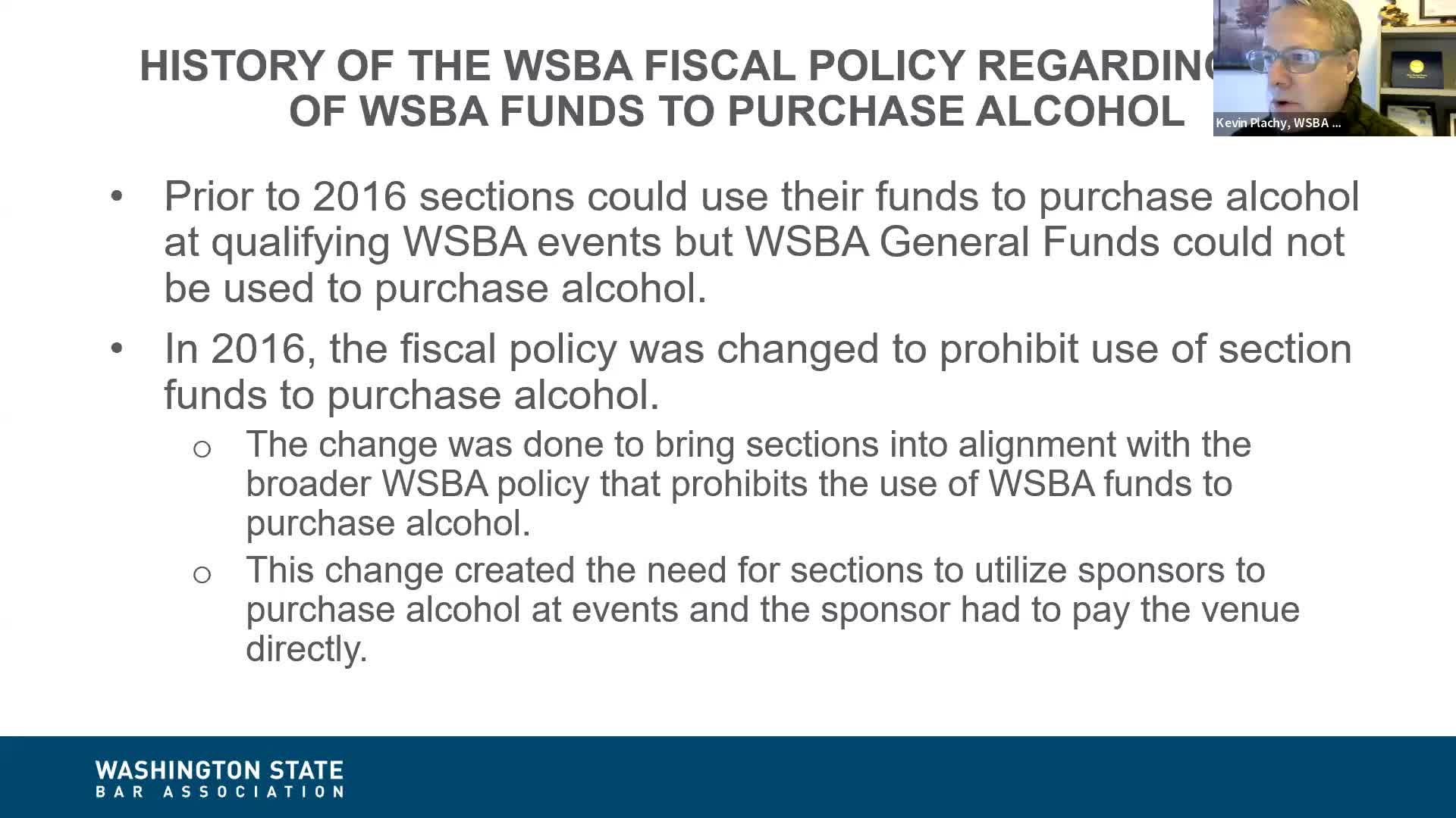 Kevin Placci, WSBA advancement department director, told section leaders the board of governors voted in July to permit the change and that it applies only to ‘‘qualifying section functions’’—events or meetings hosted for the benefit of section members and open to all section members. He added that celebrations honoring many volunteers or speakers also qualify if invitations are extended to at least eight honorees.