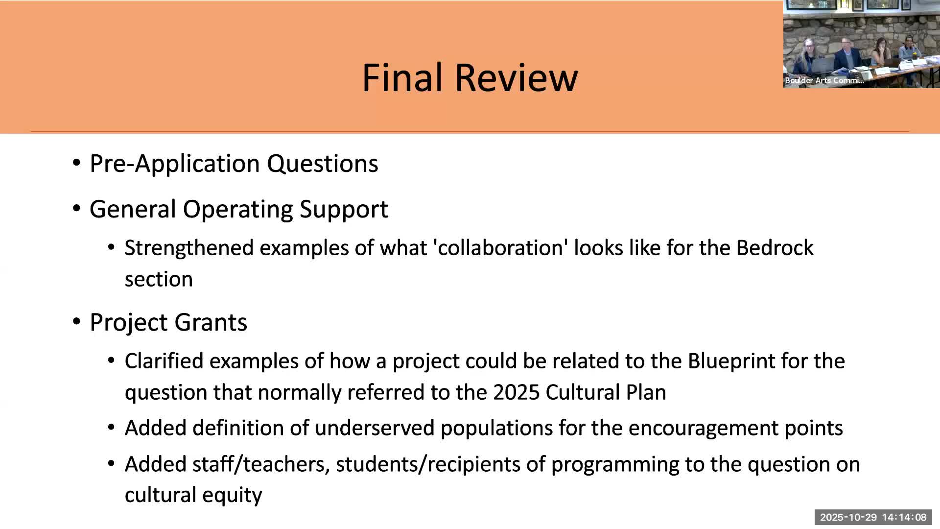 The Boulder Arts Commission on Oct. 20 approved the city’s 2026 cultural grants program, endorsing staff recommendations on process, schedule, application questions and a scoring system that expands encouragement points beyond a BIPOC focus to a broader definition of underserved populations.