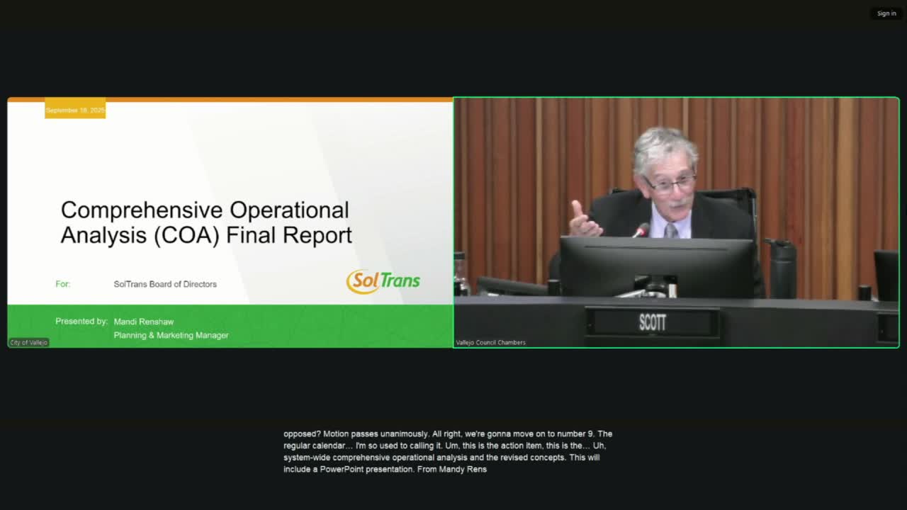 Mandy Renshaw, the staff lead for the COA, told the board the proposals were “data‑driven” and informed by months of outreach; she said the plan is intended to “increase frequency, expand service days and span, and most importantly, strengthen the connectivity both within SolTrans service and within our regional partners.” The staff presentation emphasized that changes would be cost neutral at the system level by reinvesting hours and mileage freed by discontinued segments into routes with higher demand.