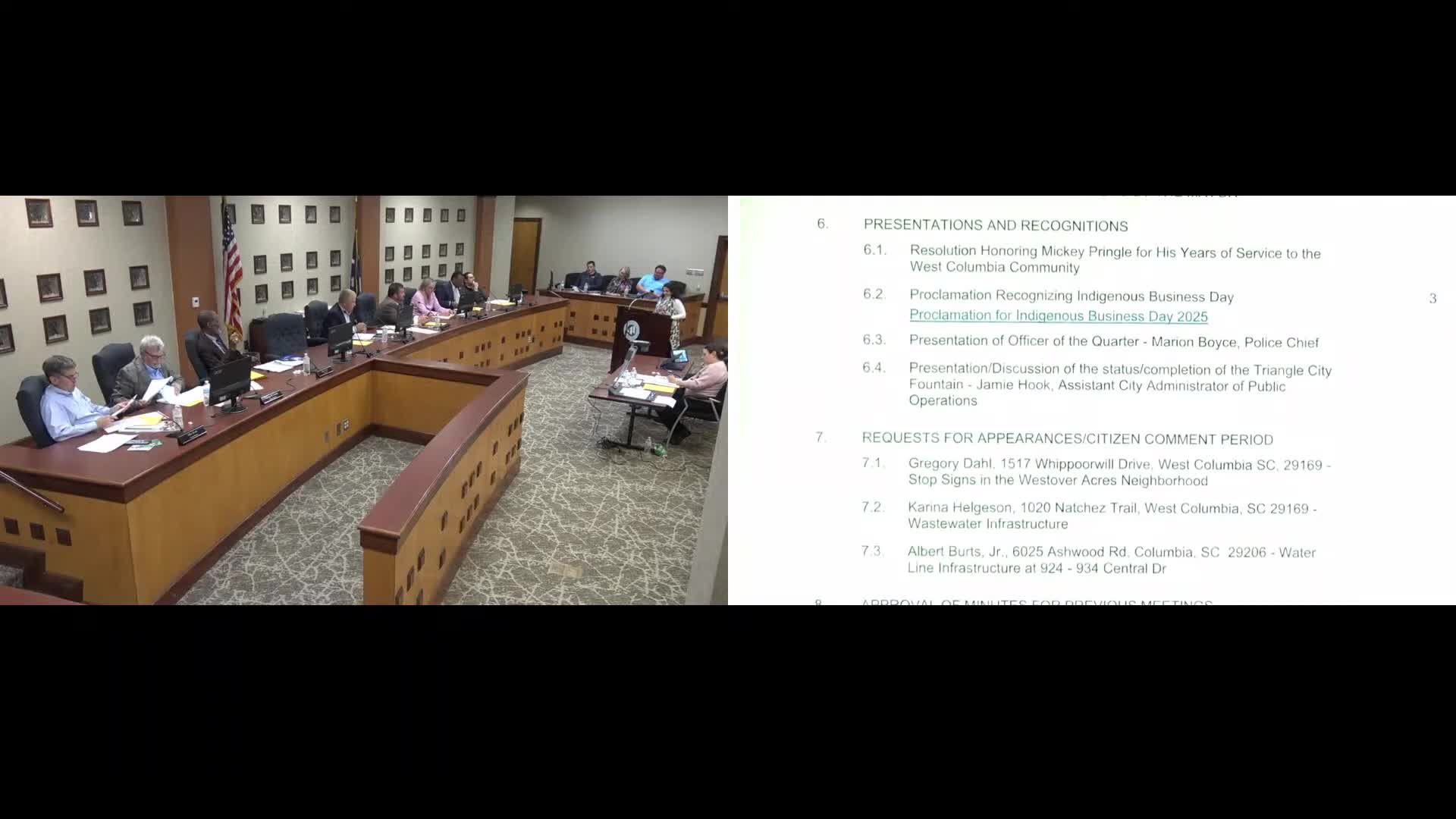 At the Nov. council meeting, Corina Helgason urged the City of West Columbia to address alleged sewage-contaminated runoff on Natchez Trail, saying children in her neighborhood have fallen ill and asking for a multi-party meeting with SCDOT, engineers and the city attorney; the mayor declined to meet because the matter is legal in nature.
