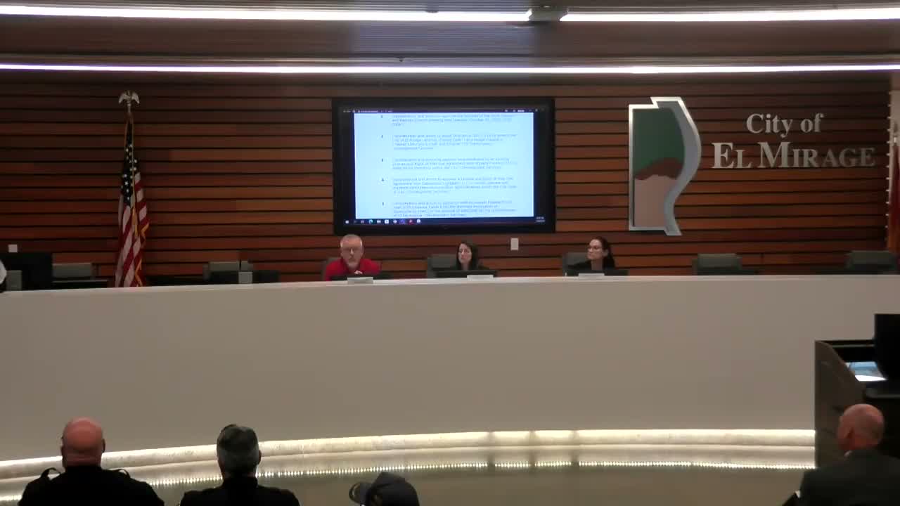El Mirage City Council approved a series of routine and capital measures at its November 2025 meeting, including telecom right-of-way agreements, a large industrial site plan, state-funded police data sharing and a major resurfacing project — while splitting on multiple fleet purchases.