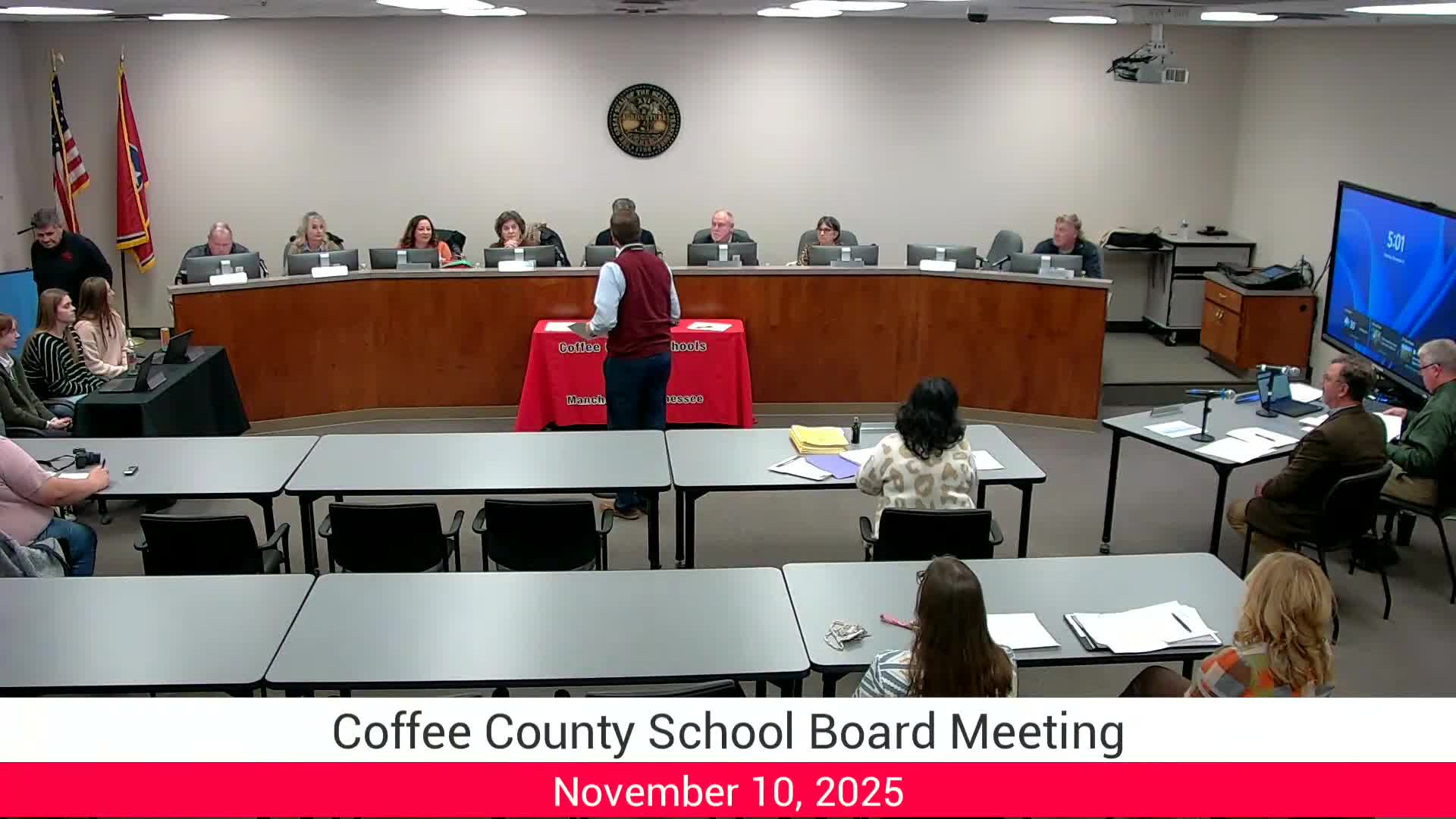 The Coffee County Board of Education opened its meeting with a recognition of coach and science teacher Christy Klaus, who has coached cheer for more than 30 years and serves as president and director of the Tennessee Cheerleading Coaches Association.
