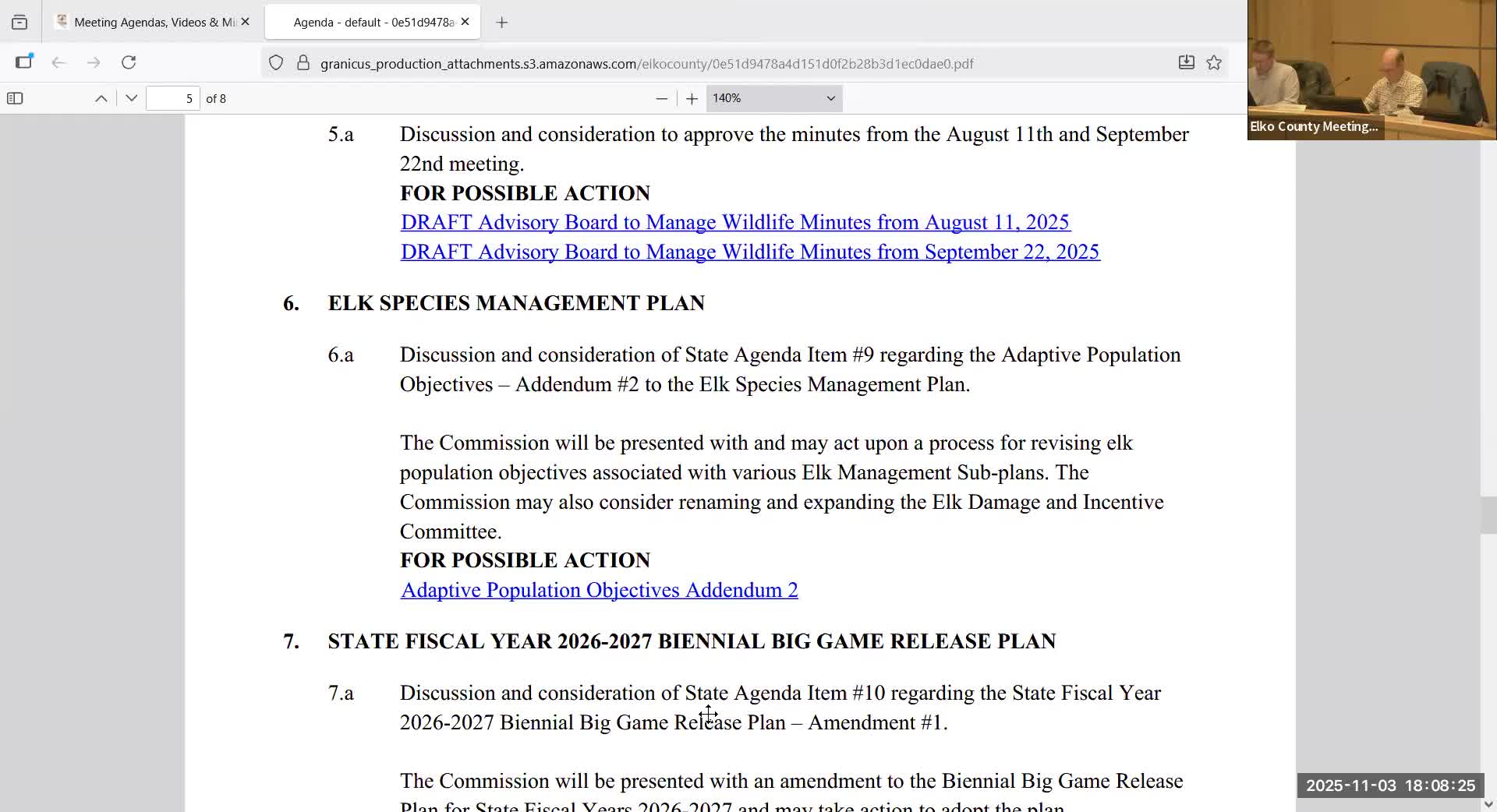The Elko County Advisory Board voted to support Addendum No. 2 to the Elk Species Management Plan, creating a six-member Elk Management Subcommittee to allow annual, limited adjustments to population objectives based on new survey and harvest data.