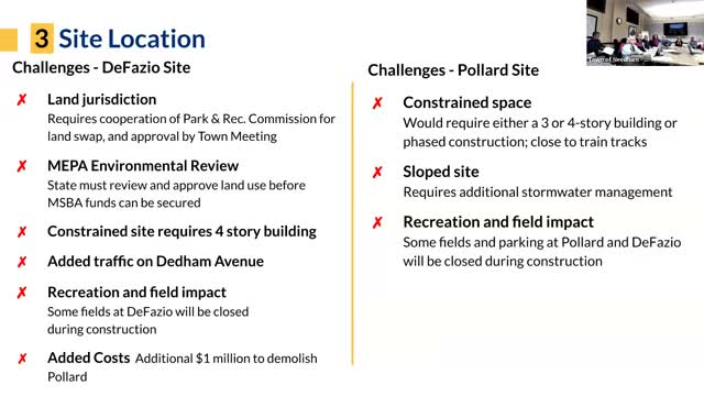 What’s next: the team will respond to MSBA’s PDP/PSR comments, finish the estimating runs, finalize RFQ language and timing for the CMR procurement, and continue inter‑board discussions (including a town‑wide public meeting) in the coming weeks. The committees emphasized that site selection hinges on whether the town accepts the reimbursement and permitting risks attached to DeFazio or prefers the more straightforward MSBA participation path at Pollard.
