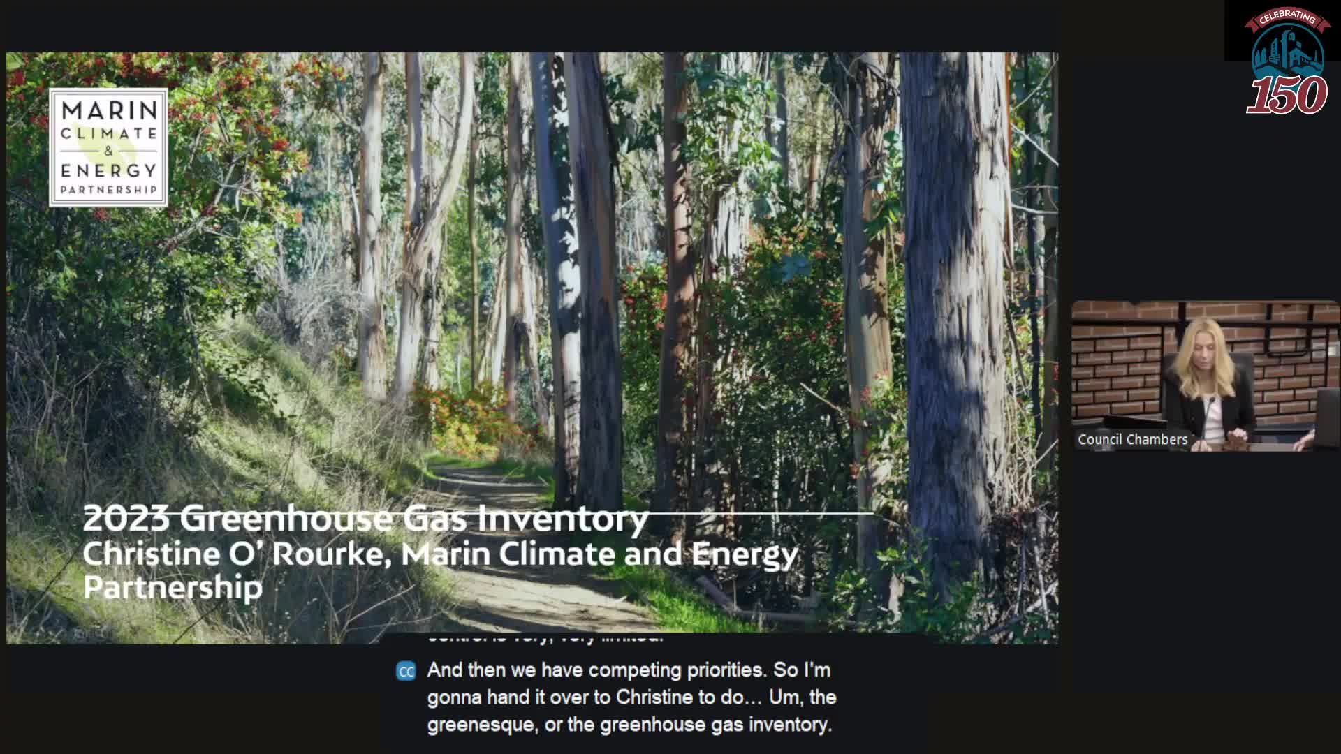 Corey Bittoff (sustainability staff) framed the presentation and introduced Christine O'Rourke of the Marin Climate and Energy Partnership, who presented the 2023 inventory. "Two-thirds are coming from the transportation sector," O'Rourke said, adding that "about 80% come from passenger vehicles." The inventory shows electricity emissions fell substantially between 2022 and 2023 due to more renewable energy on the grid, while natural gas-related emissions rose slightly in 2023 because weather-driven heating demand was higher.
