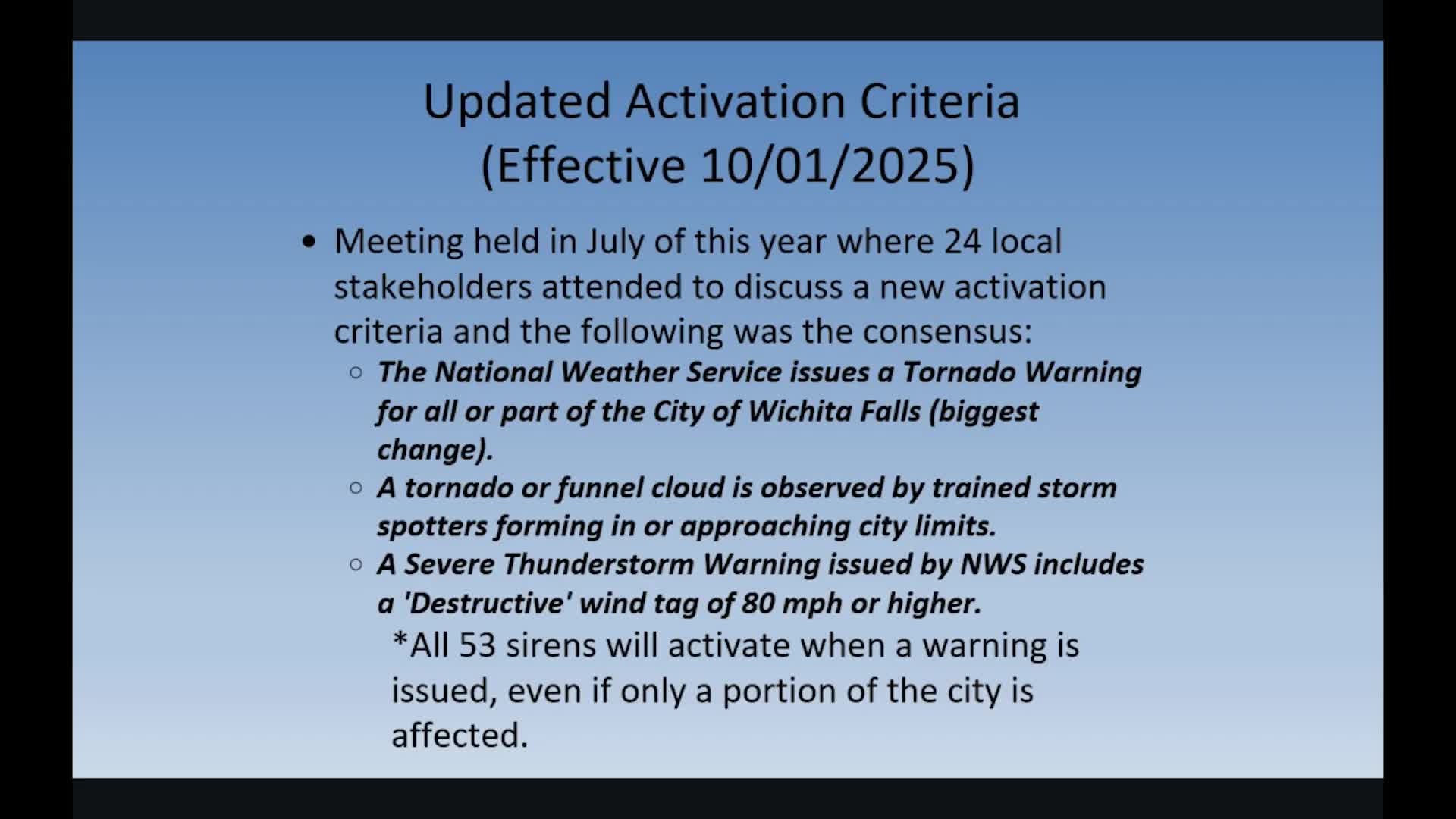 Chief Melton said the principal change is to sound the city's sirens when the National Weather Service issues a tornado warning covering all or part of Wichita Falls. Previously, activation criteria were more limited and required confirmation that left staff deciding at the final moment whether to activate. The revised criteria also call for activation when a severe thunderstorm warning includes a destructive-wind tag of 80 miles per hour or greater or when a trained storm spotter observes a funnel cloud forming in or approaching city limits.
