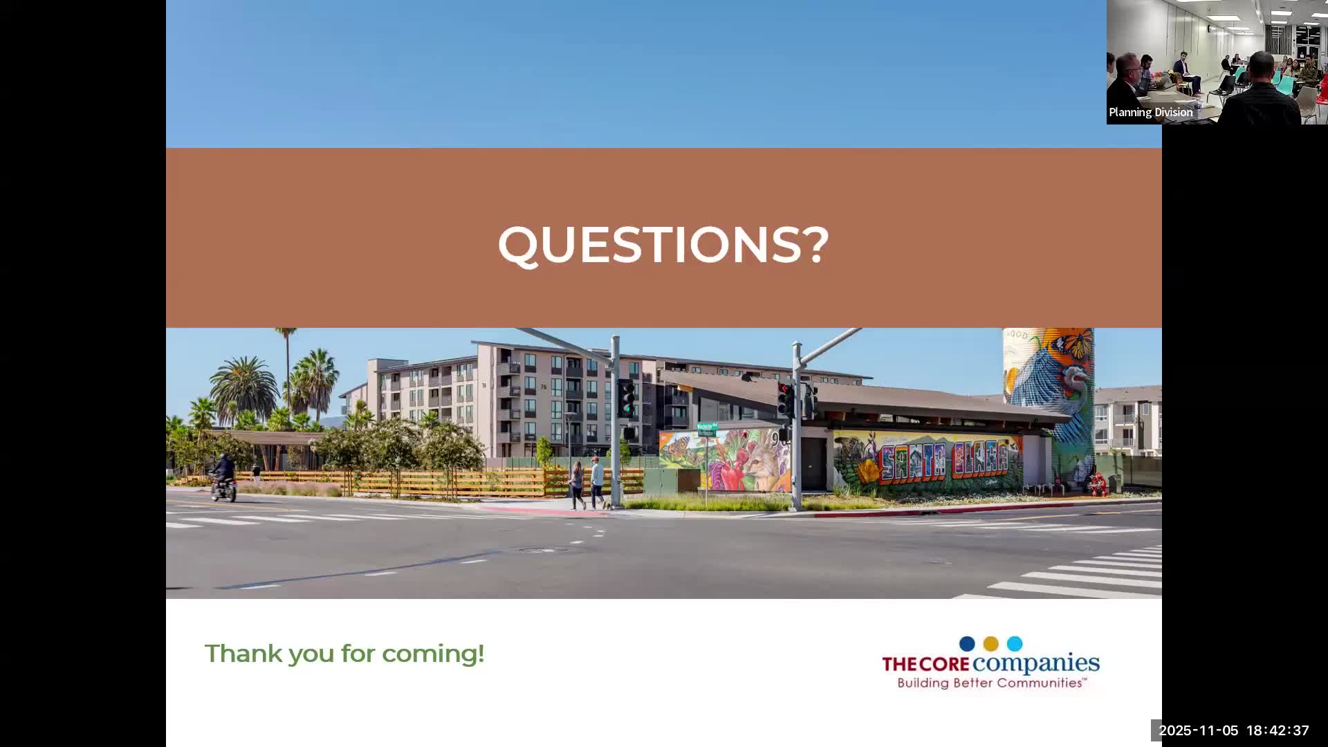 Residents questioned comparisons with other local higher‑density projects; Core representatives acknowledged continuing debate about density but said the decision is driven by market and financing realities rather than preference. The developer said completing the community now — including the cafe, farm and senior housing already occupied — provides neighborhood benefits that a site left vacant would not.