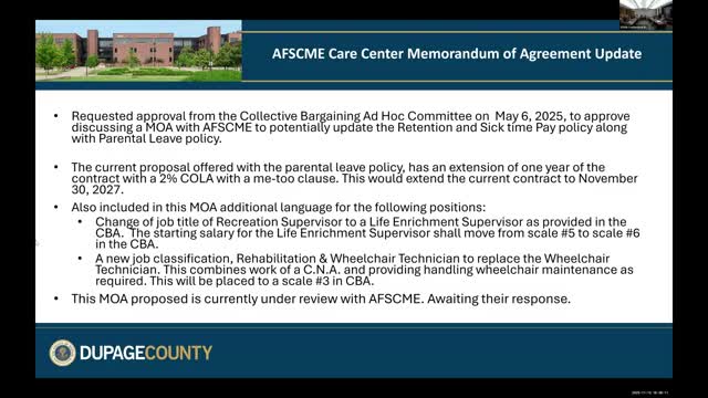 DuPage County staff told the ad-hoc collective bargaining committee on Nov. 12 they are negotiating a memorandum of agreement (MOA) with AFSCME on behalf of a county care center and asked for informal approval to pursue terms that would extend the contract by one year and add certain benefits.