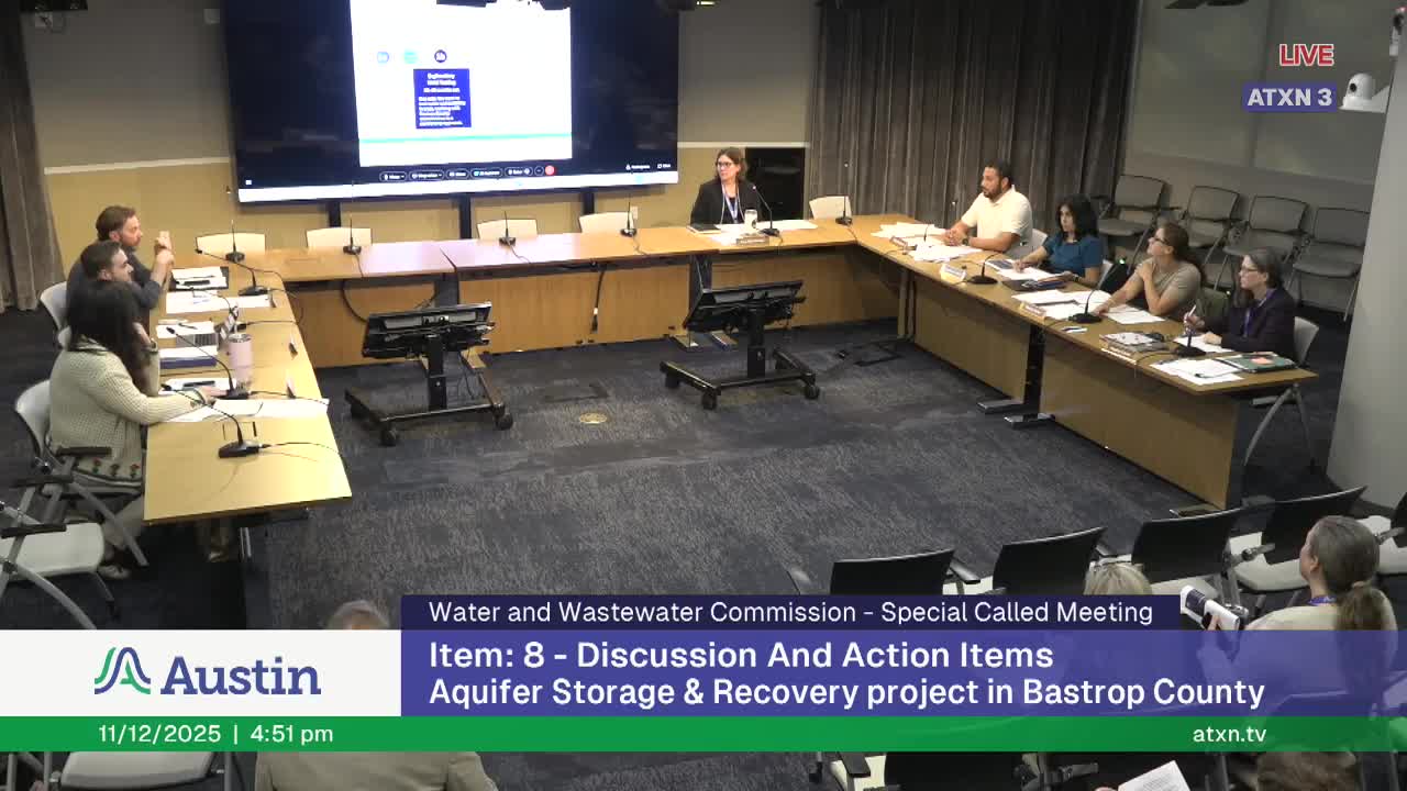 The Austin Water & Wastewater Commission on Thursday recommended City Council approve a collaboration agreement for stakeholder engagement during laboratory and field testing of Austin's proposed aquifer storage and recovery (ASR) project. After the ASR briefing and public comment, commissioners moved through the remainder of the published agenda and approved several routine procurement and construction items by show-of-hands votes.