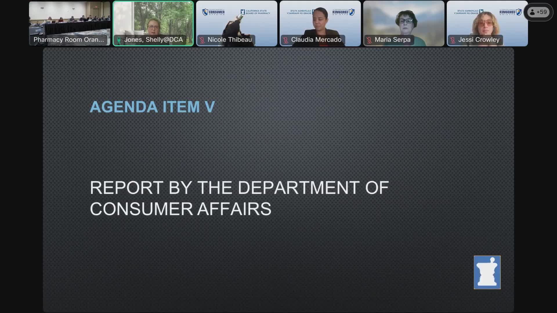 Shelley Jones of the Department of Consumer Affairs told the Board of Pharmacy that Governor Newsom appointed Lucy Saldivar as deputy director of board and bureau relations; DCA rolled out updated harassment‑prevention and unconscious‑bias trainings via LMS, and staff said a DCA reorganization takes effect in July 2026.