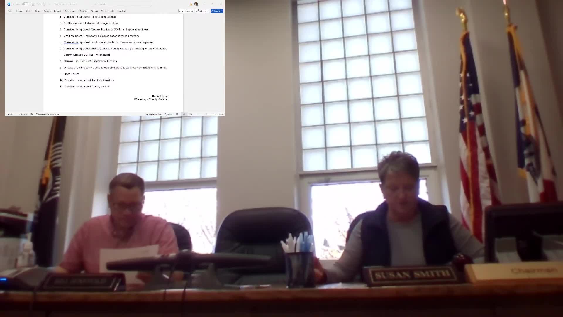 Winnebago County supervisors approved a set of routine financial actions, including auditors’ transfers, county claims and the final payment to Young Plumbing and Heating for mechanical work at the county storage building.