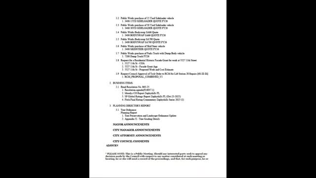 The Zephyrhills City Council voted unanimously on Nov. 10 to approve a bond resolution authorizing the issuance of up to $33 million in capital improvement revenue bonds to fund a new public‑works maintenance facility, Zephyr Park improvements (including Alice Hall meeting/classroom space) and related capital projects.