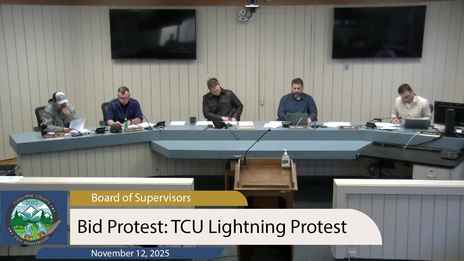 Tuolumne County’s Board of Supervisors voted unanimously on Nov. 12, 2025 to award a $1,893,350 contract to Anvil Builders for Phase 2 lightning-complex disaster debris and hazard-tree removal and to approve related budget and contracting actions.