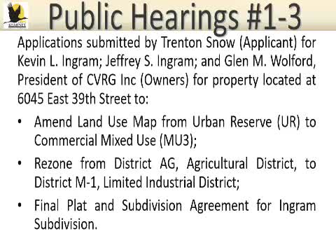 After a presentation by a land surveyor, the Kearney City Council amended the land-use map, adopted an ordinance rezoning 6045 E. 39th Street to M-1 (limited industrial), and approved the final plat and subdivision agreement for Ingram Subdivision.