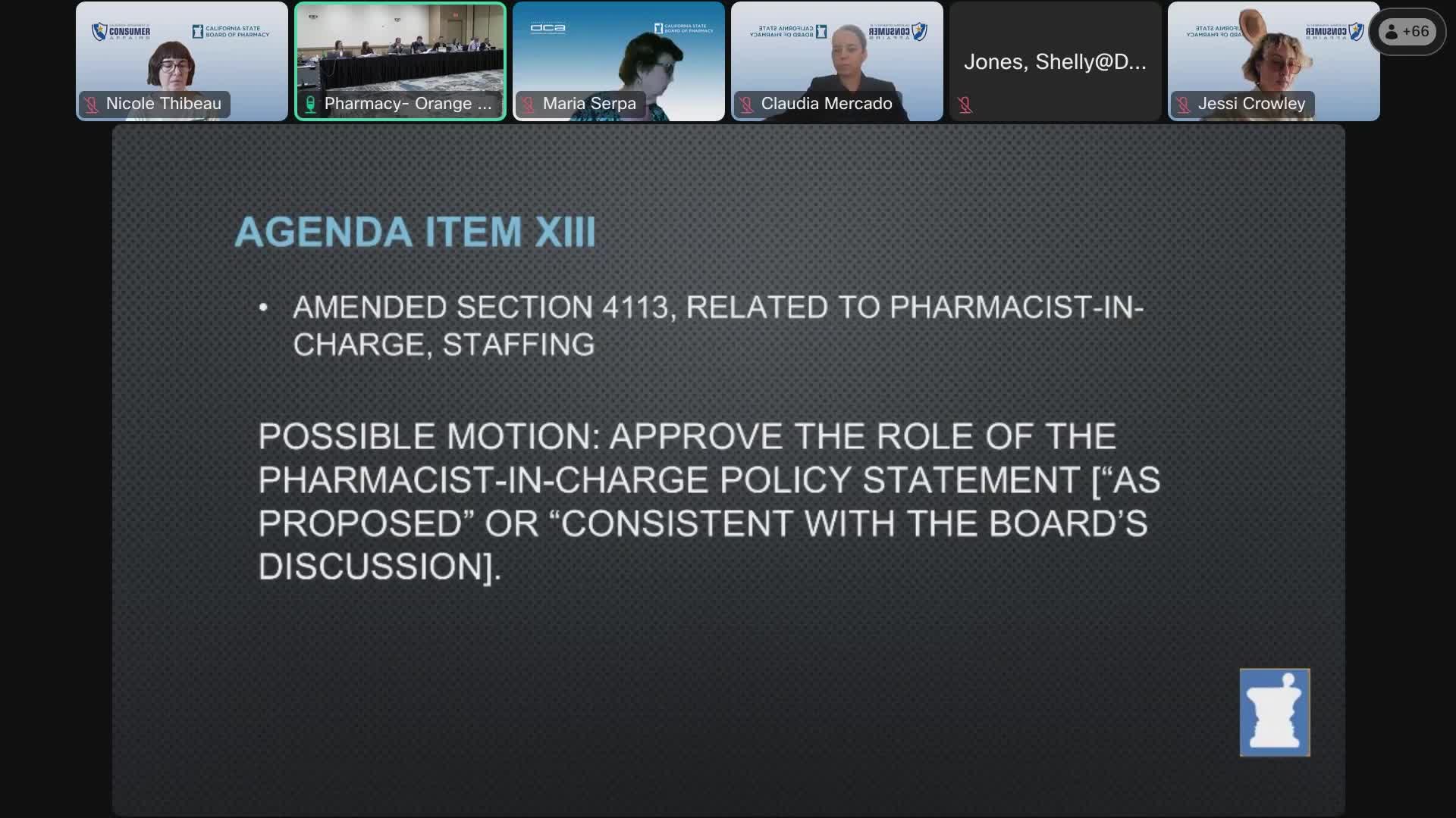 The Board of Pharmacy voted to initiate rulemaking to amend California Code of Regulations Title 16, section 17.93.7 to allow greater flexibility in setting pharmacist‑to‑pharmacy‑technician ratios in the inpatient/hospital setting.