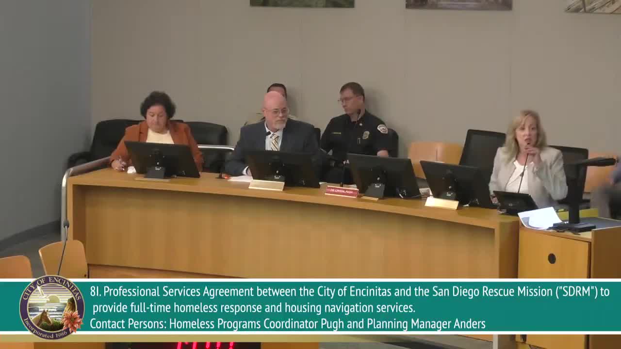 The Encinitas City Council voted unanimously to approve a professional services agreement with San Diego Rescue Mission to provide street outreach, case management and housing navigation services under the city’s Homeless Action Plan.