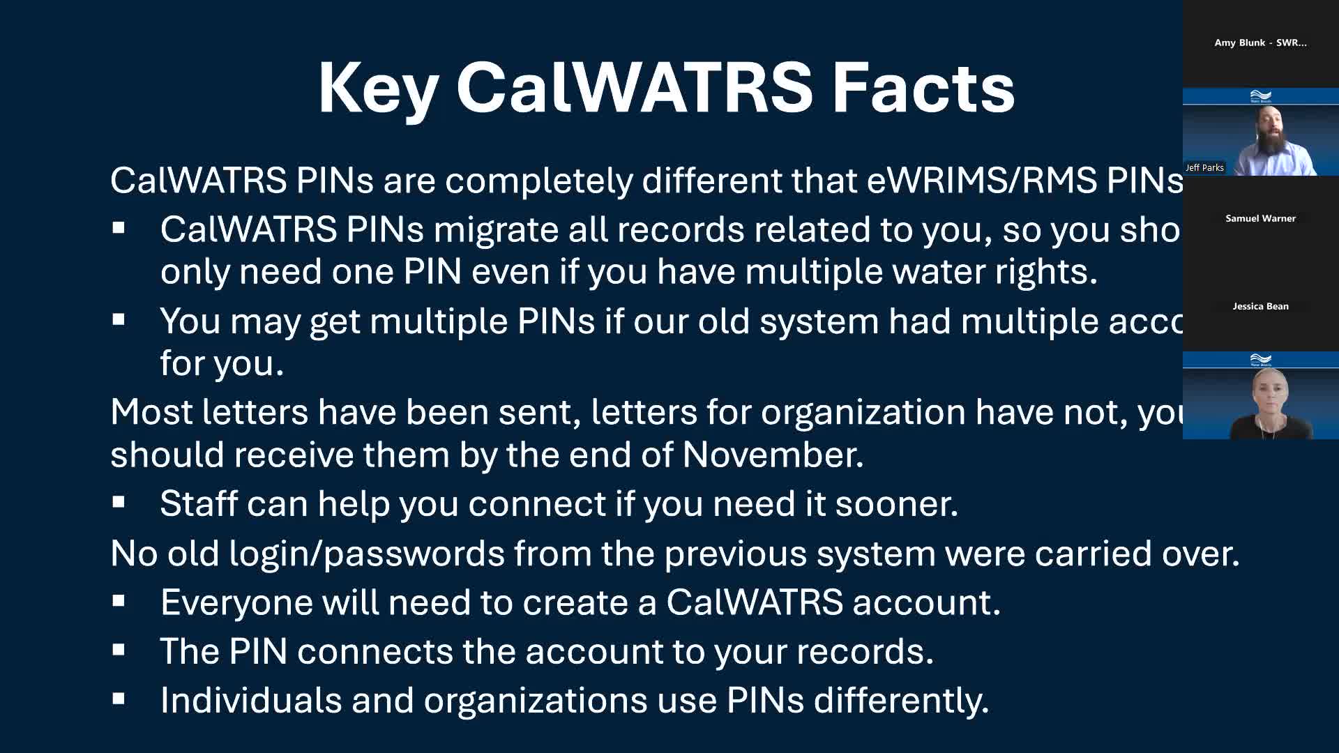 Parks said the Board mailed about 12,000 letters containing one-time PINs to individual water‑right holders to link their previous records to the new system. "This PIN is different; it is not the same PIN that you received in the past," Parks said, explaining a single Cal Waters PIN links all records associated with an individual rather than issuing separate credentials per water right.