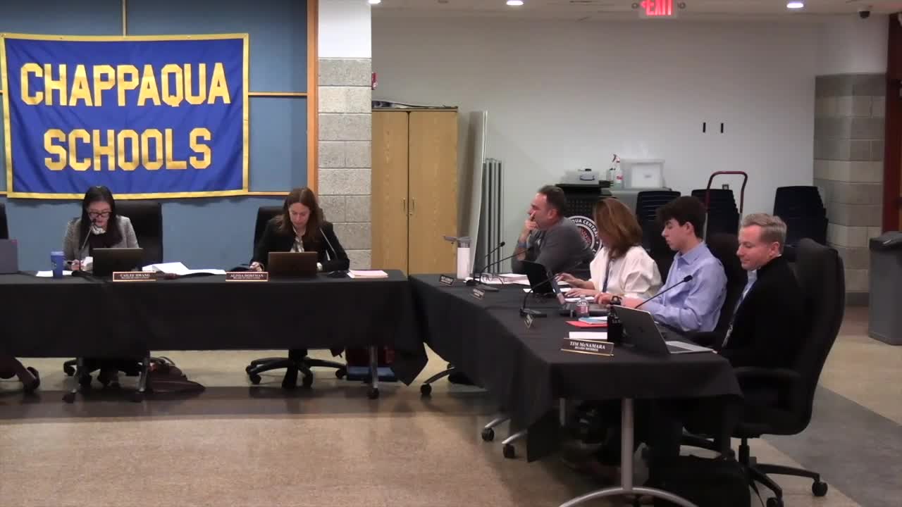 The Chappaqua board adopted Policy 97D (recording workplace conversations) for staff, held a first reading of a revised high-school Internet-enabled device policy proposing district-issued pouches for non-instructional spaces, and approved routine consent-agenda items and contracts.