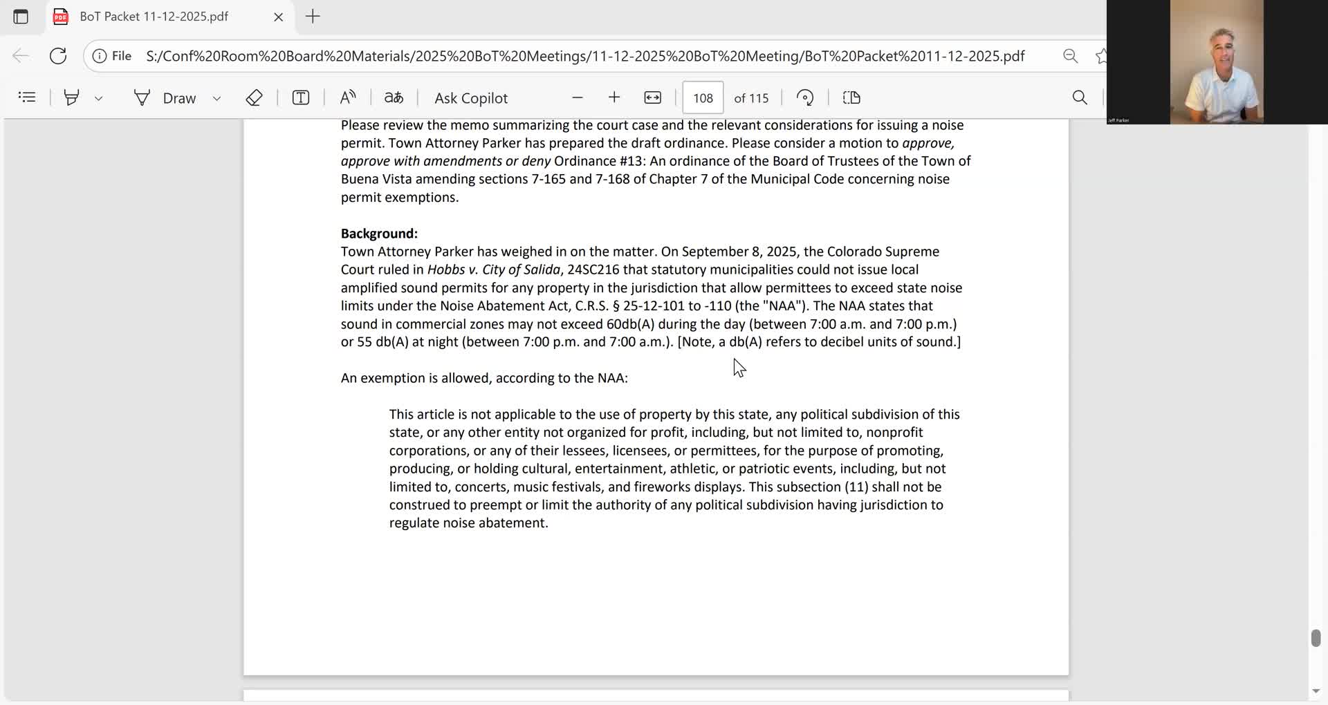 Jeff told trustees the Salida decision prevents a business that merely holds a permit from claiming an exemption to noise limits; instead, the exemption applies when the activity is part of the municipality’s own endorsed activities such as a town‑sponsored fireworks display or a nonprofit‑run community event. “What matters is who is making the noise,” Jeff said, summarizing the court’s guidance.