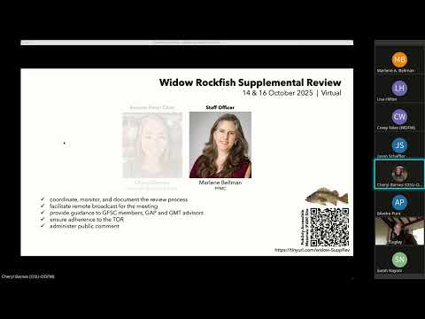 The Pacific Fishery Management Councils groundfish subcommittee convened a supplemental review of the widow rockfish stock assessment to evaluate a proposed updated base model and the responses to 14 review requests. Chair Cheryl Barnes opened the session by noting that the meeting was recorded and that the "PAM" website contains the assessment reports, model files and previous assessments for review.