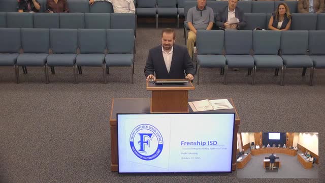 At a board meeting, Frenship ISD Director of Finance Hunter Locasio presented the district—s Financial Integrity Rating System of Texas (FIRST) report and said the district scored 90 out of 100 possible points, earning a "superior" rating for the 20th consecutive year. "We earned a 90% for 2425," Locasio said, explaining the 2425 FIRST report is based on audited 2023—24 financial data.
