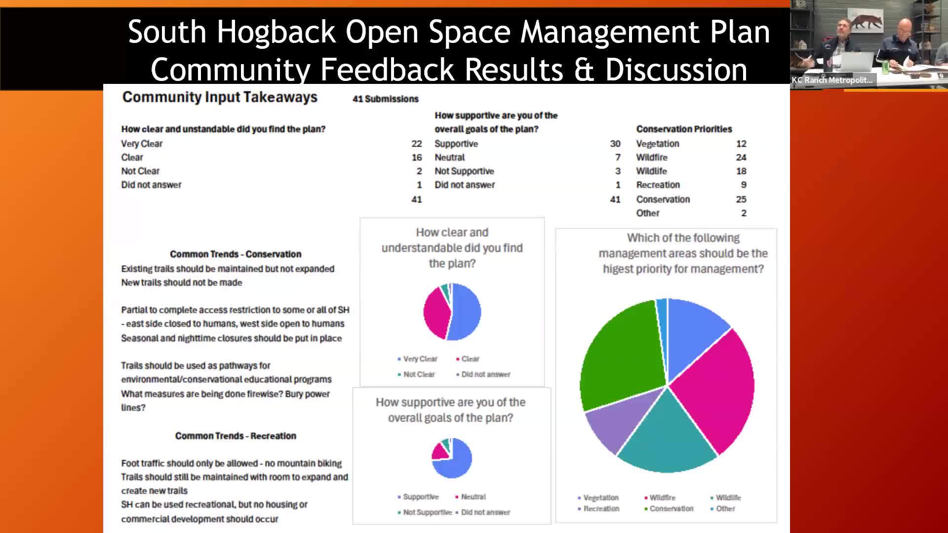 Task force members and district staff presented results of community feedback on the South Hogback open-space management plan at the Ken-Caryl Metropolitan District board meeting on Nov. 11, 2025. Staff said they received 41 submissions and that the responses were largely neutral or supportive of the proposed management approach.