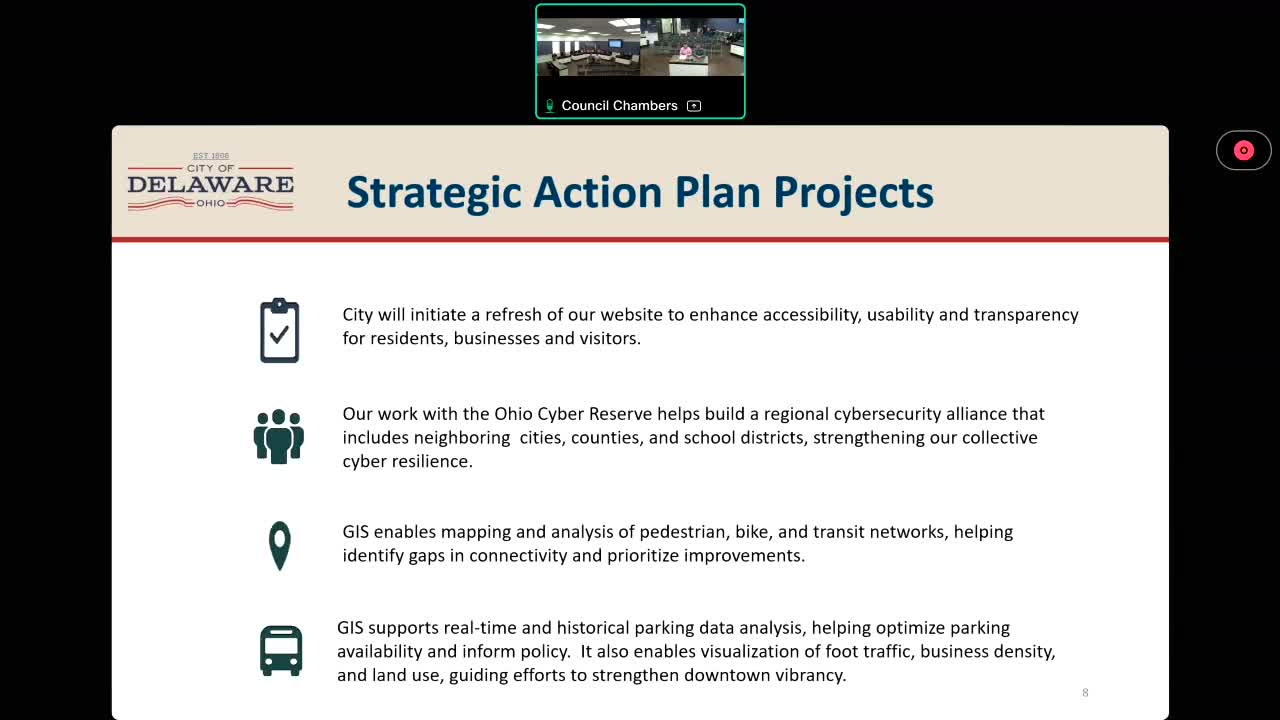Delaware City IT outlined priorities including an ADA‑compliant website project required by April 2027, expanded cybersecurity aligned to NIST controls and Ohio Cyber Reserve collaboration, and GIS and camera refresh initiatives for 2026.