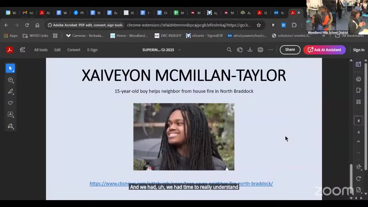 Xavion McMillan Taylor was recognized by the Woodland Hills School Board and local officials for entering a burning North Braddock house on Oct. 22, dialing 911 and helping an elderly neighbor to safety; the board and multiple elected officials presented proclamations and awards.