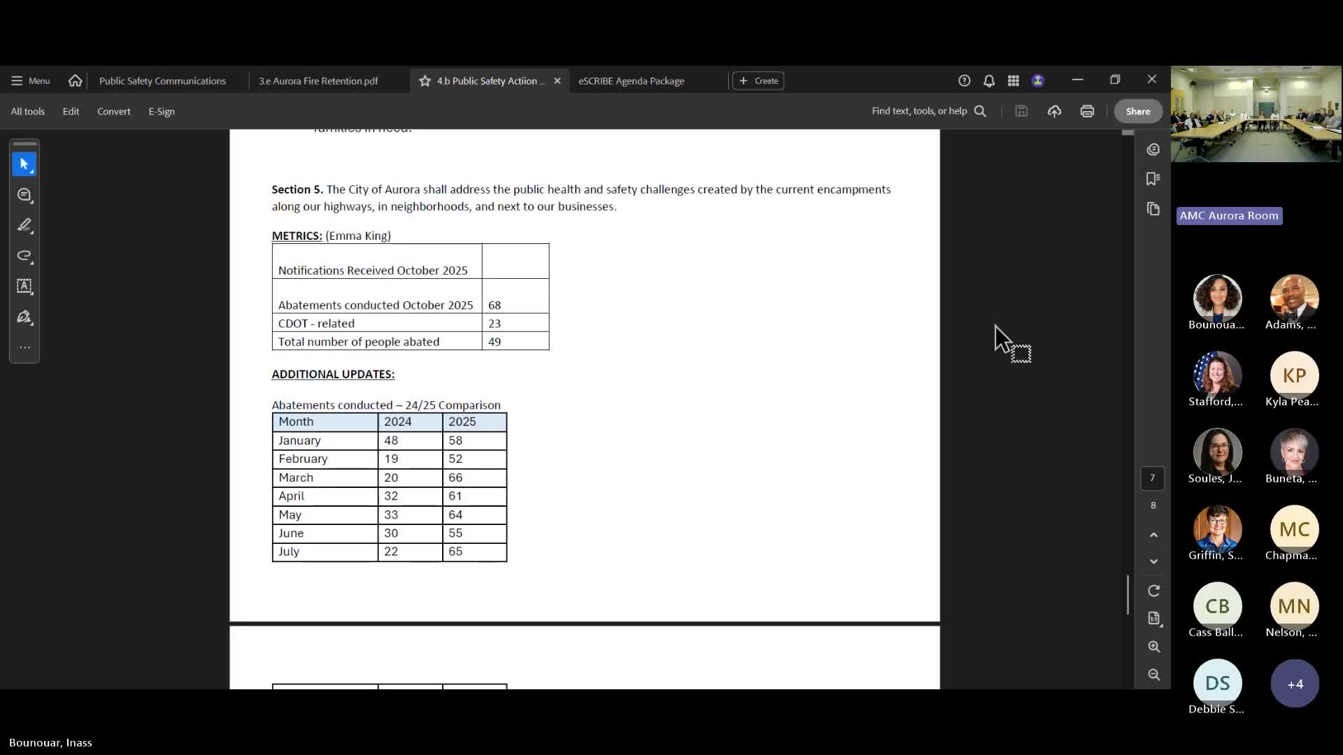 The Public Safety Committee reviewed progress on Aurora’s Navigation Campus, youth‑violence interventions and crisis response teams, with staff describing transitions of services to the on‑site center and steps to stabilize referrals and clinician support.