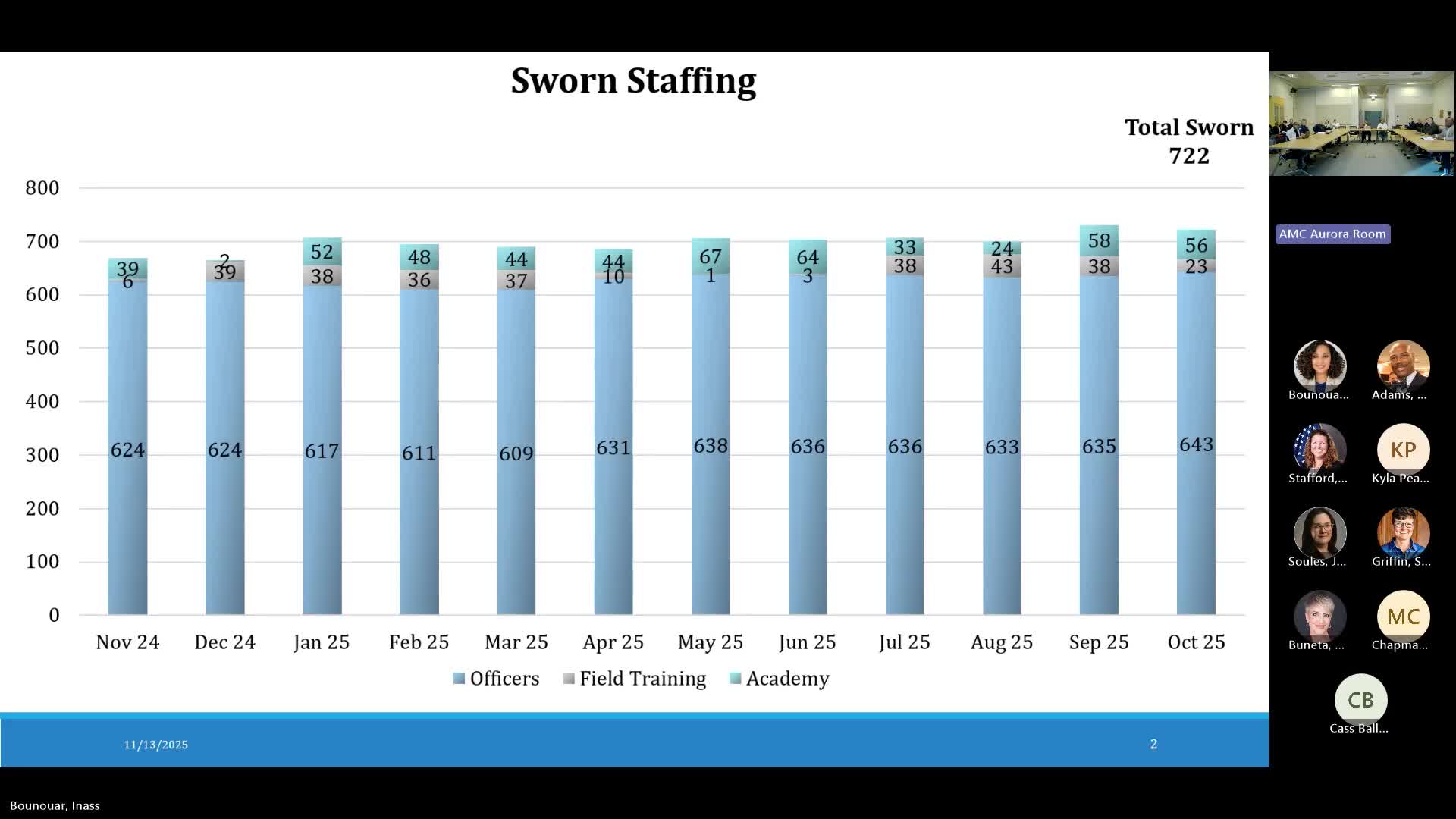 Speaker 5, identified in the meeting as the police chief, told the committee the department has “authorized 748, current 722 with 26 vacancies,” and that an academy class next January is expected to add "30 to 40" recruits and several lateral officers. “We’re really excited about that,” the chief said, describing plans to continue hiring to approach authorized levels.
