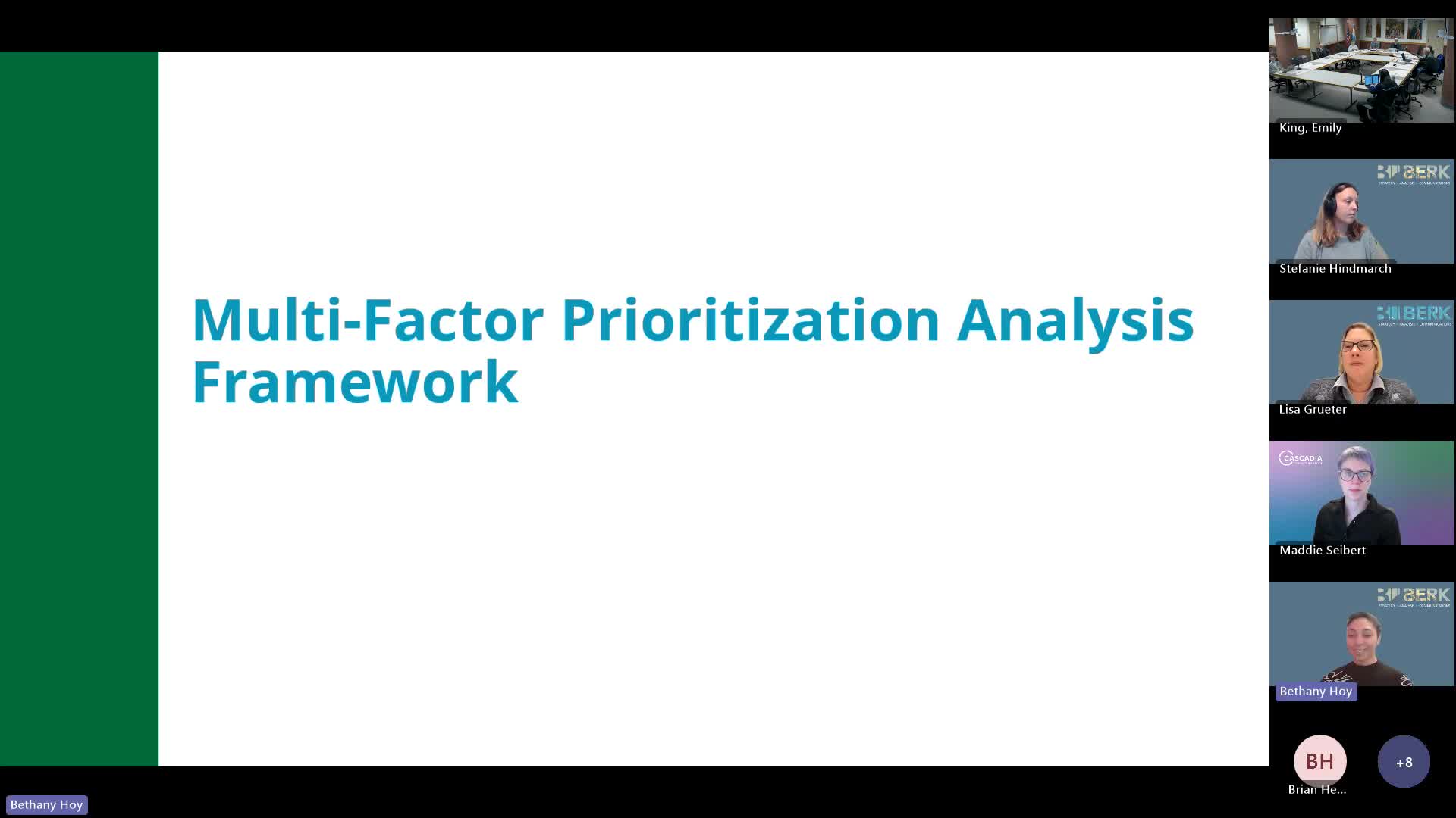 Consultants from Burke presented the multi‑criteria prioritization analysis (MCPA) the CRSB will use to narrow 50+ candidate policies to an achievable list of roughly 20–40 priorities.