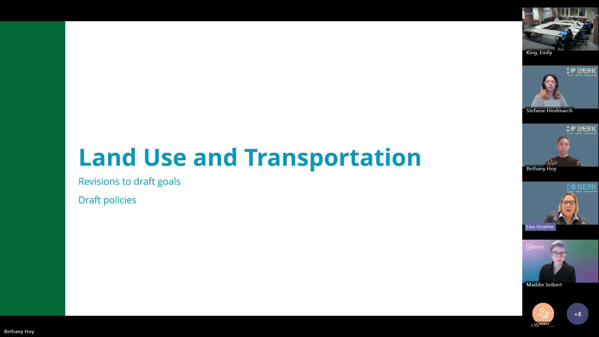 Chair (Climate Resilience and Sustainability Board) opened the meeting by thanking staff and consultants and saying, “The packet that we got today, the memos were really, I thought, really well done.” Consultants from Burke then walked members through goals and policies intended to reduce vehicle miles traveled, increase housing diversity and protect natural systems.