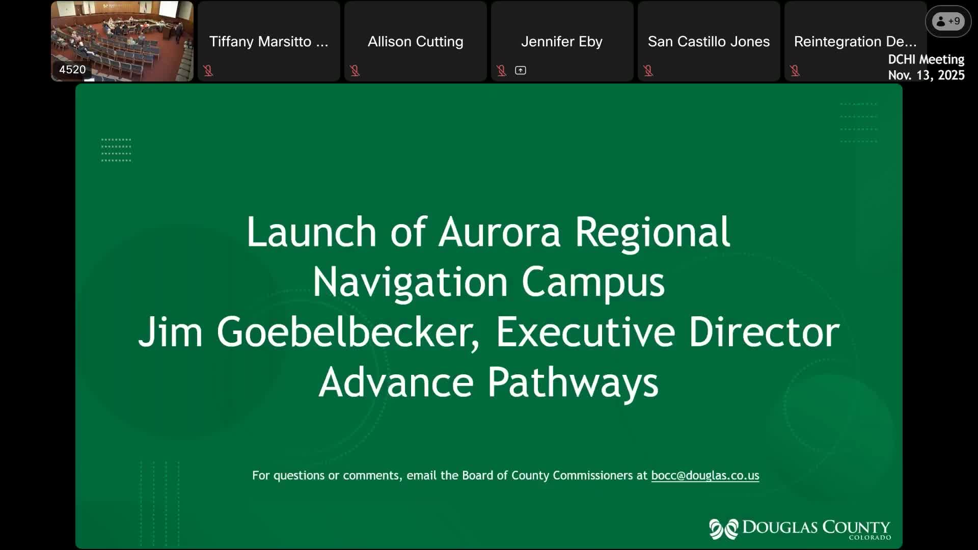 Advanced Pathways operator Jim Gobelbecker told the Douglas County executive committee the Aurora Regional Navigation Campus will open Monday the 17th, offering tiered shelter for adults, workforce training rooms, partner case management and 20 respite beds; the site will allow pets and includes outsourced kennel services.