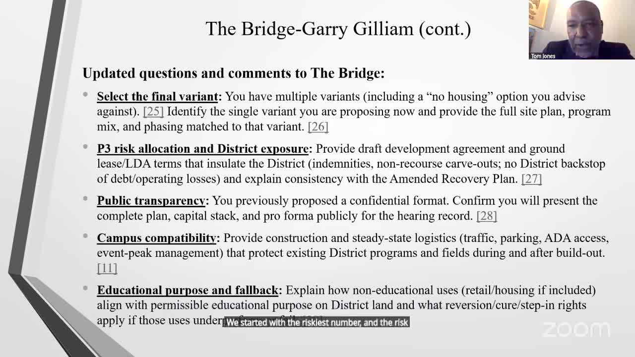 On the key question of risk, Bridge representatives said they could secure rate locks and use a construction manager‑at‑risk under a guaranteed maximum price to limit scope creep. "We would sign up for and get into a rate lock," Tom Jones said, adding the team had discussions with prospective lenders and general contractors to improve investor confidence.