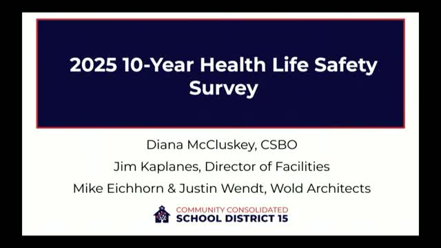 Wold Architects reported a 10-year health and life-safety survey identifying roughly $32.5 million in recommended work (A: $491,000; B: $27.8 million; C: $4.2 million) including electrical fixes, HVAC and roofing, delaminating cabinets and ADA door clearances; district staff discussed funding timing and planned ISBE life-safety application.