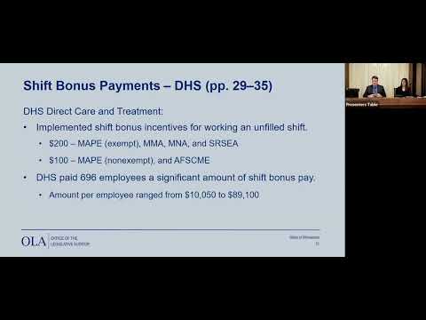 The Office of Legislative Auditor told a finance subcommittee that Minnesota paid about $367 million in overtime and $37 million in shift bonuses from July 2022—12/2024, found seven findings across five agencies and identified $6.6 million in DHS shift bonuses paid after a programs expiration; agencies said they accept the findings and will recoup overpayments and strengthen controls.